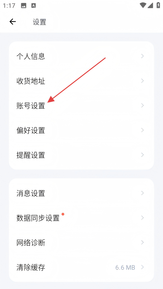 2、在设置页面,点击【账号设置】选项,进入账号设置页面。