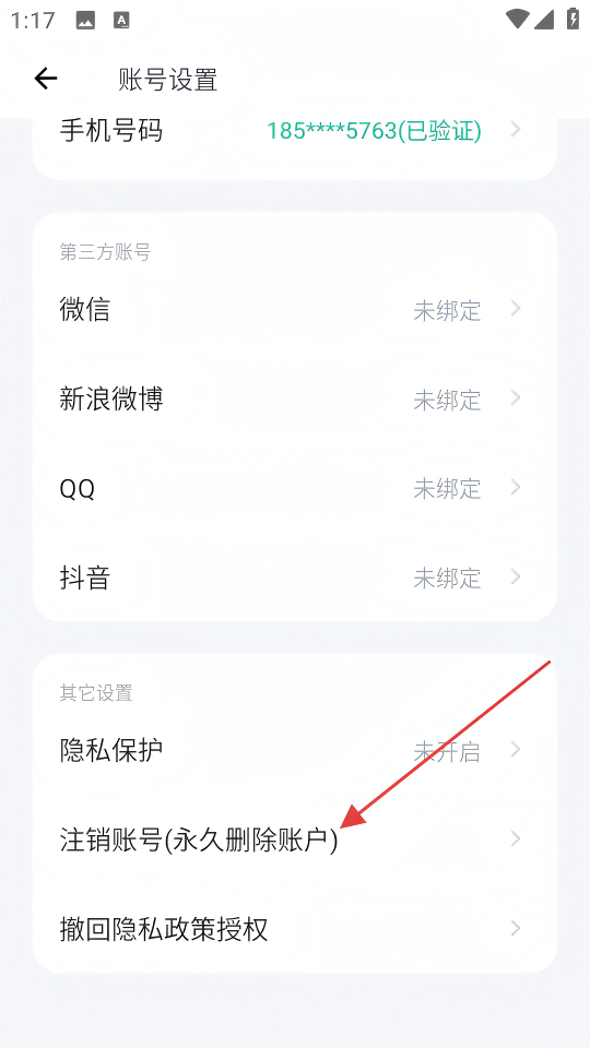 3、在账号设置页面,点击【注销账号(永久删除账户)】选项,进入注销账号页面。