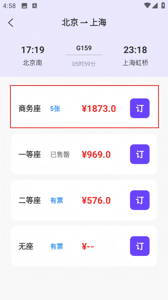 4、在座位类型选择页面,选择座位类型,点击对应的【订】按钮,即可进行订票操作。