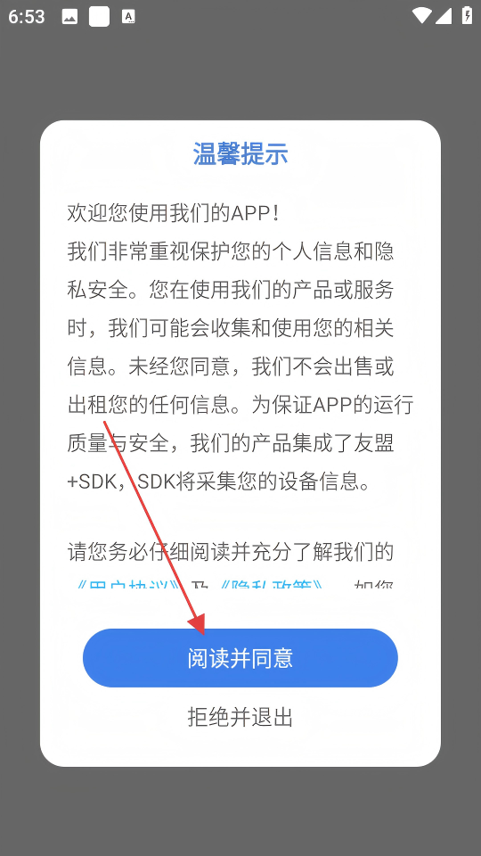 1、在温馨提示弹窗中,点击【阅读并同意】按钮,进入APP首页。