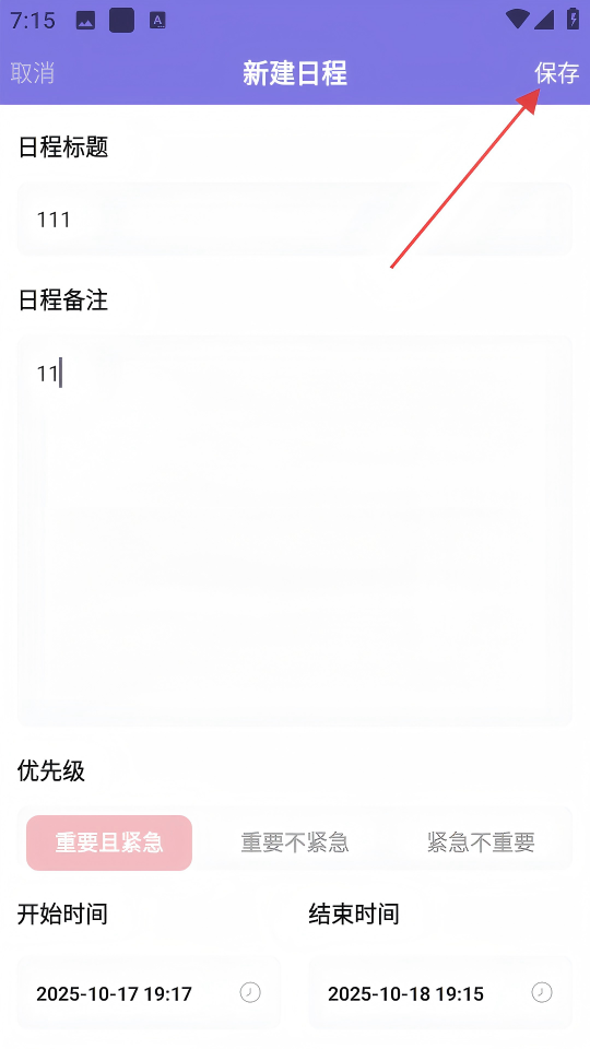 3、在新建日程页面,填写日程标题、日程备注,选择优先级,点击右上角【保存】按钮。
