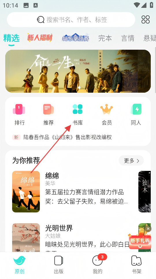 1、在原创页面,点击【书库】选项,进入分类页面。