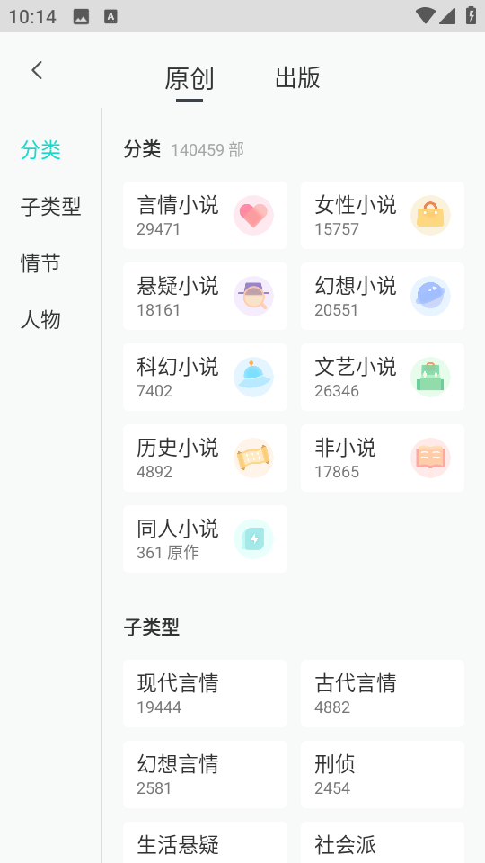 2、在分类页面,点击【言情小说】选项,进入言情小说列表页面。