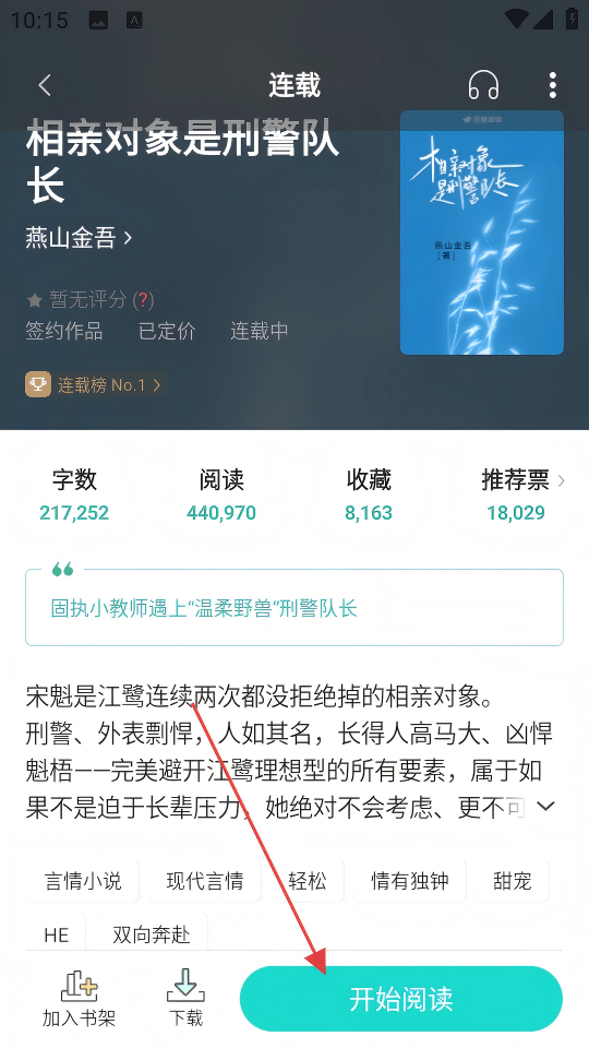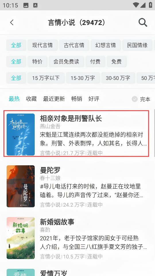 3、在言情小说列表页面,选择《相亲对象是刑警队长》小说,进入其详情页面。