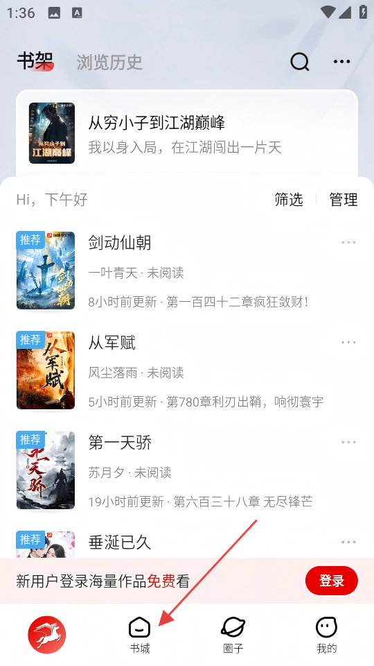 1、在应用页面,点击底部【书城】选项,进入书城页面。