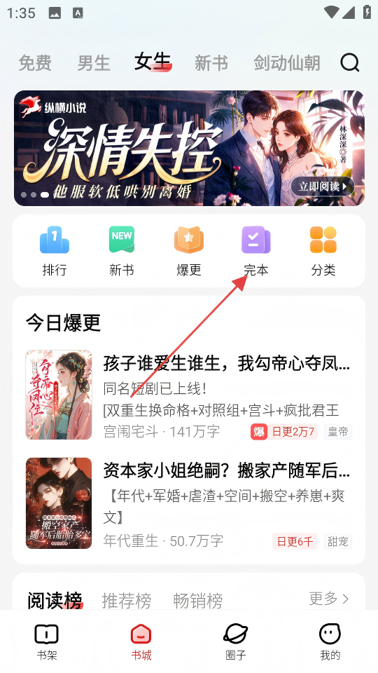 2、在书城页面的女生分类下,点击【完本】选项,进入完本小说列表页面。