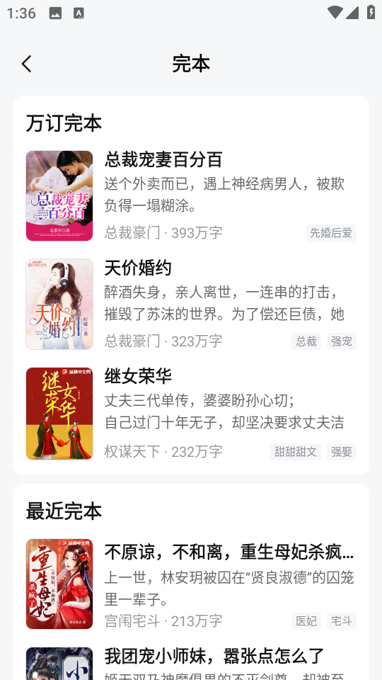 3、在完本小说列表页面,选择《总裁宠妻百分百》小说,进入其详情页面。