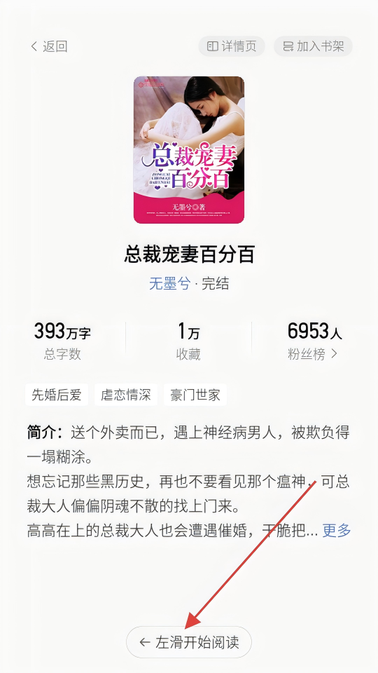 4、在小说详情页面,左滑开始阅读,即可开始阅读该小说。