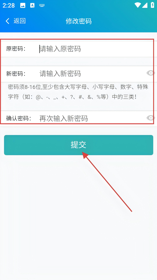 4、在修改密码页面,依次输入原密码、新密码、确认密码后,点击【提交】按钮,完成密码修改操作。