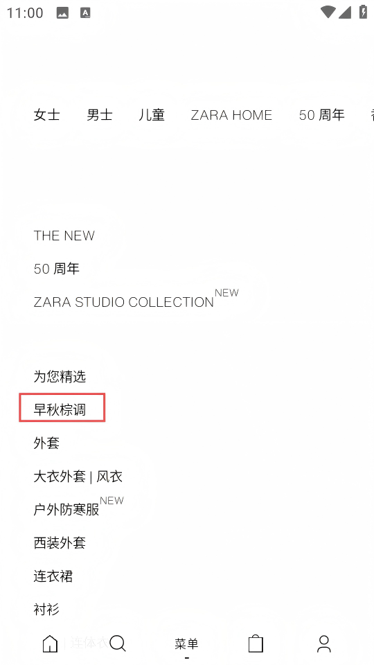 1、在ZARA应用页面,点击底部【菜单】选项,进入菜单页面。