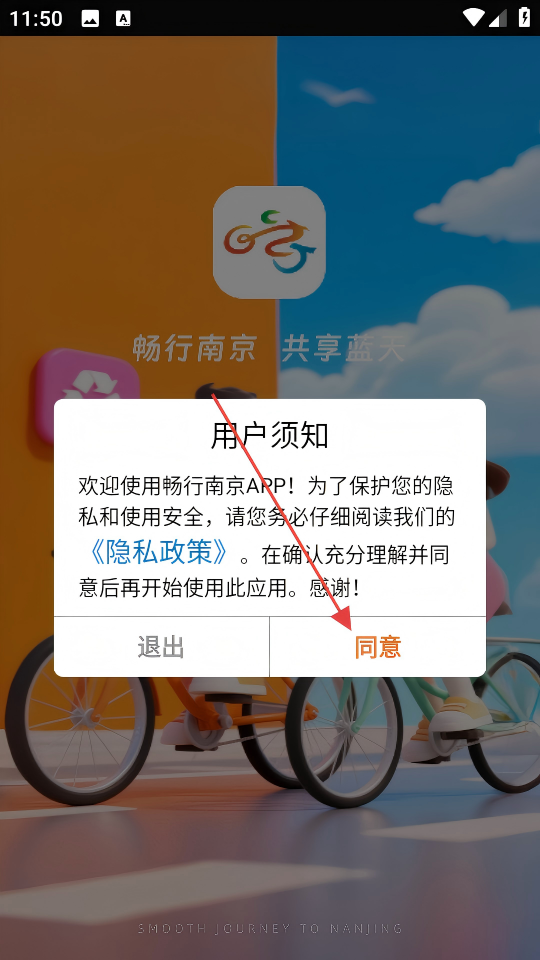 1、在畅行南京APP的用户须知弹窗中,点击【同意】按钮,进入应用主页。