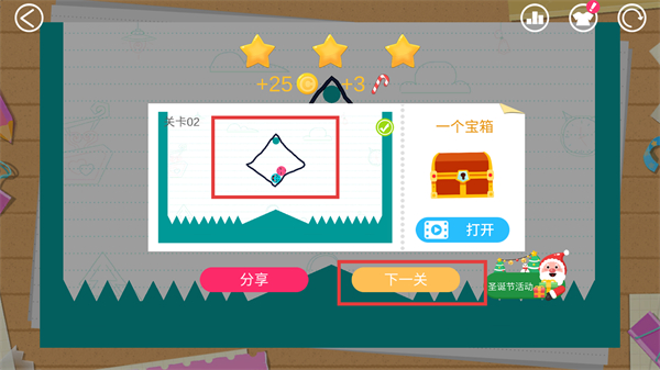 4、小球亲亲后通关,会获得【25金币】和三星奖励,点击【下一关】按钮就能继续挑战新关卡咯。