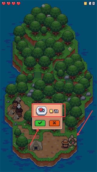 3、在弹出的兑换窗口选择【爱心】与【金币20】组合点击绿色对勾兑换提升角色生存状态。
