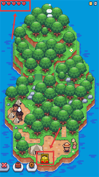 4、找到岛上的【宝箱】点击打开获取奖励同时关注左上角爱心数量维持角色良好生存状态。