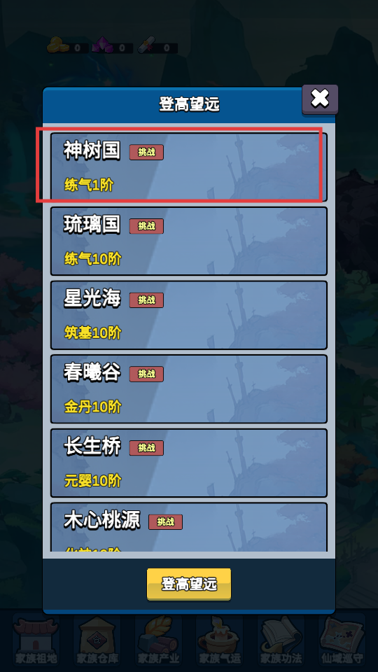 2、登高望远先挑战【神树国-练气1阶】,低阶易通关,积累经验资源,助力家族发展。