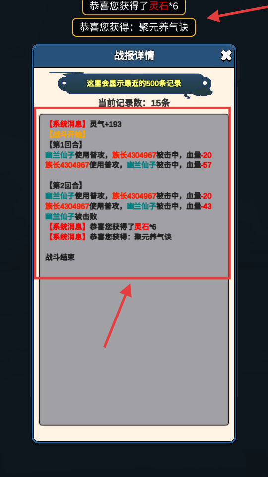 3、战斗后查看【战报详情】,了解过程、获灵石-聚元养气诀,总结经验提升收益。