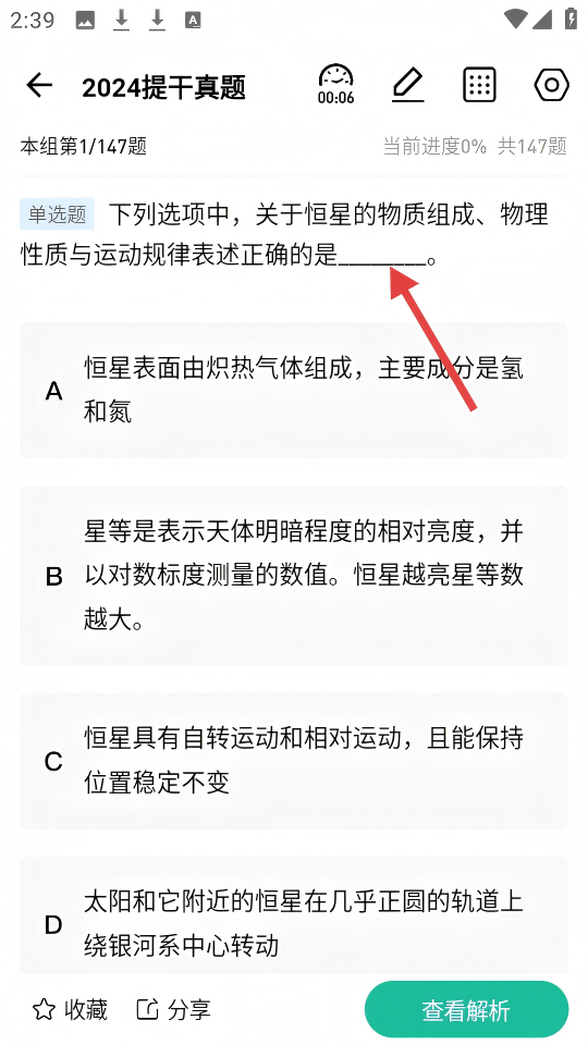 4、在真题答题页面,查看单选题题目后选择选项,也可点击【查看解析】查看答案解析。