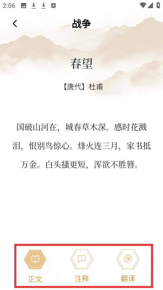4、在《春望》的详情页面,可查看正文,也能点击【注释】或【翻译】按钮,查看诗词的注释和翻译内容。