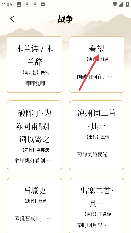 3、在战争主题的诗词列表中,点击【春望】,进入该诗的详情页面。