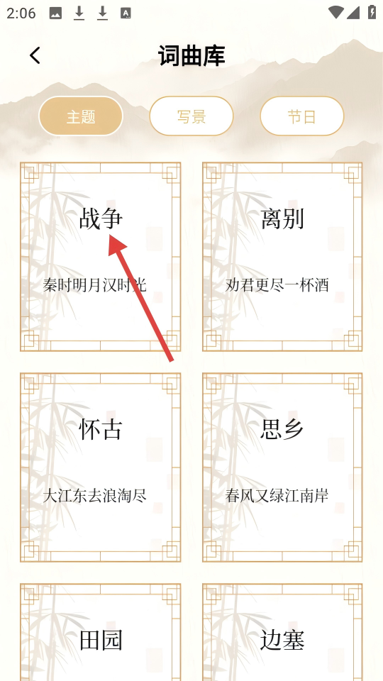 2、在词曲库的主题页面,点击【战争】分类,进入战争主题的诗词列表。