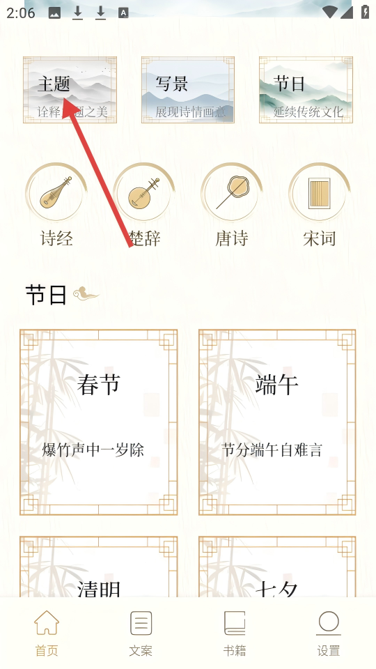 1、在首页,点击【主题】选项,进入词曲库的主题页面。