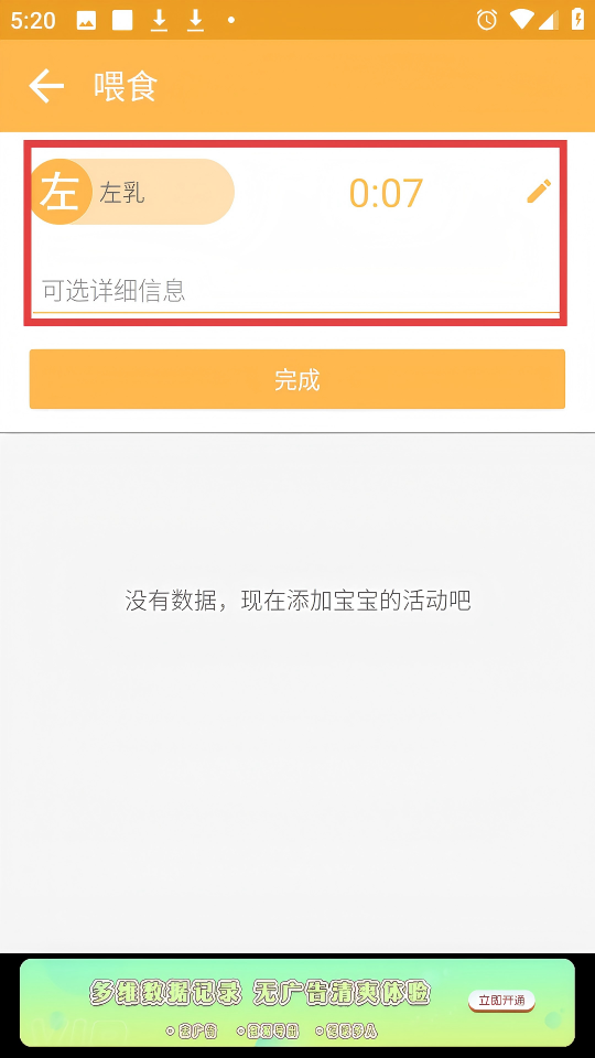 4、左乳喂养计时过程中,可填写详细信息,之后点击【完成】。