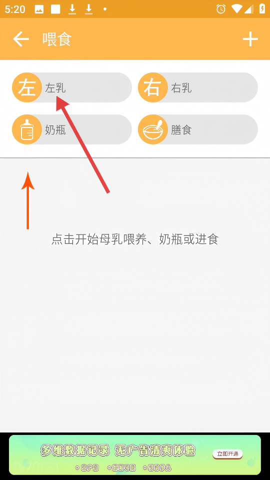 3、在喂食页面,点击【左乳】,开始母乳喂养计时。