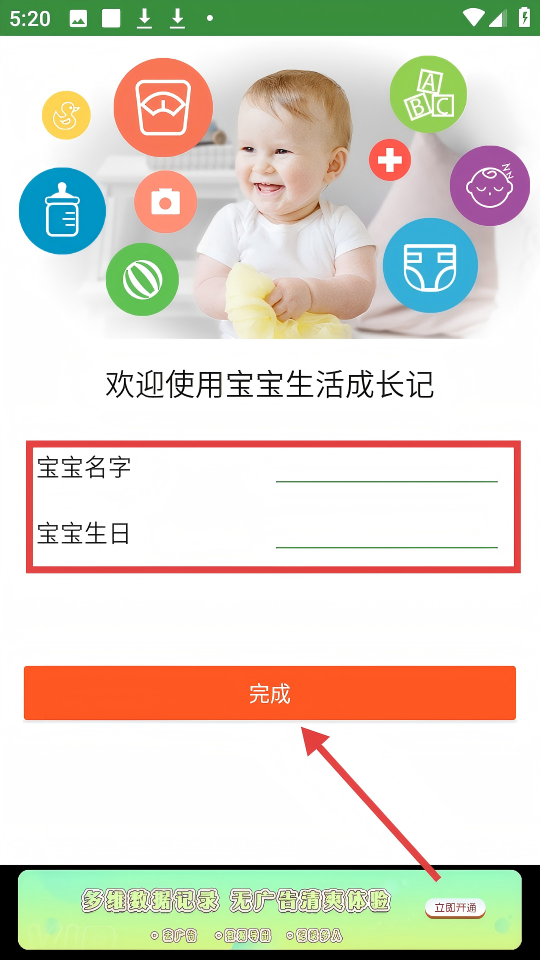 1、进入软件,填写【宝宝名字】和【宝宝生日】,然后点击【完成】。