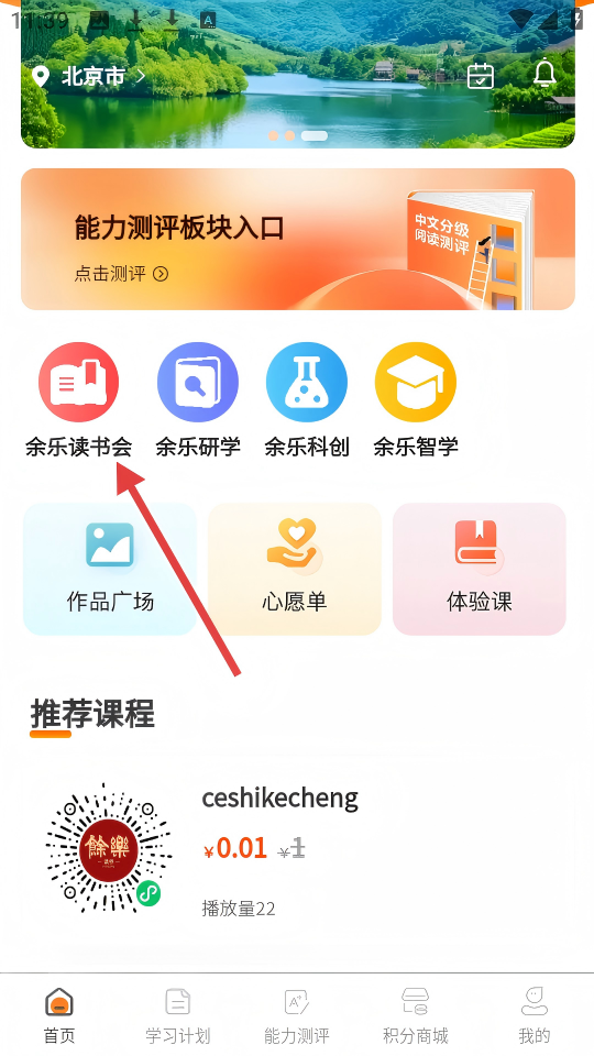 1、进入软件,在首页,点击【余乐读书会】图标,进入课程分类页面。