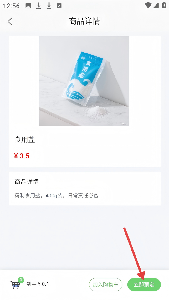 4、在【食用盐】商品详情页,点击【立即预定】按钮,可预定该商品。