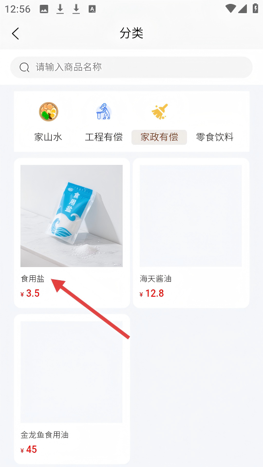 3、在分类页面,点击【食用盐】商品,进入其详情页面。
