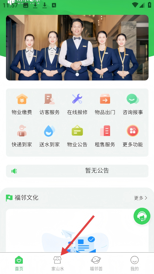 1、点击底部【家山水】选项,进入家山水页面。