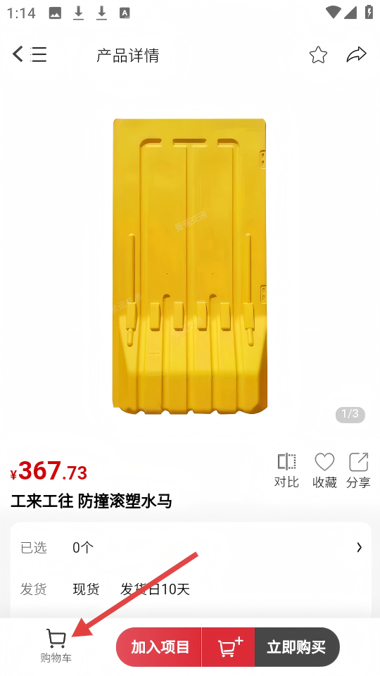 3、进入【工来工往防撞滚塑水马】产品详情页后,点击左下角【购物车】按钮。