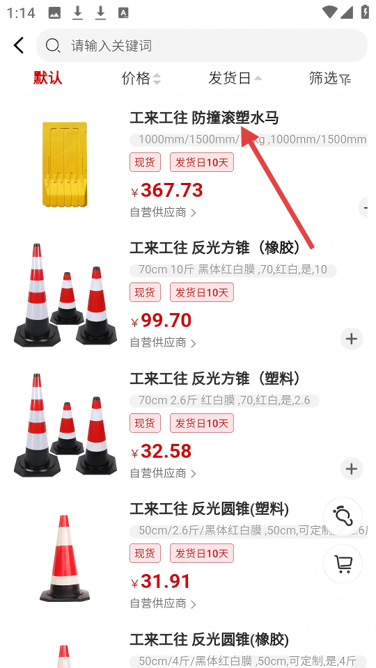 2、在商品列表页,找到【工来工往防撞滚塑水马】,点击可进入产品详情页。