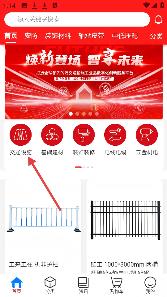 1、在首页点击【交通设施】分类,可进入相关商品列表页。