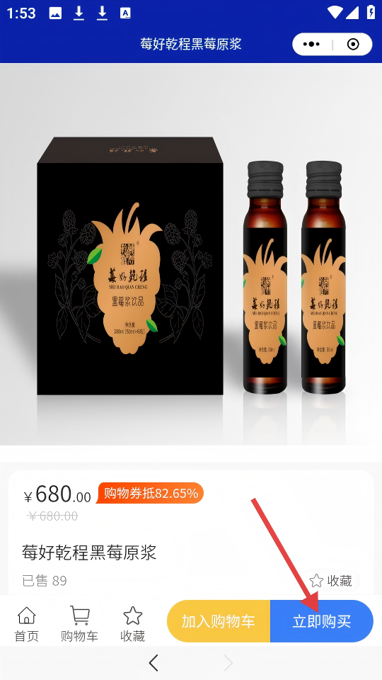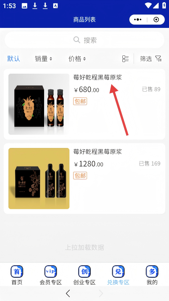 3、在商品列表页,点击【莓好乾程黑莓原浆】(售价¥680.00的商品)。