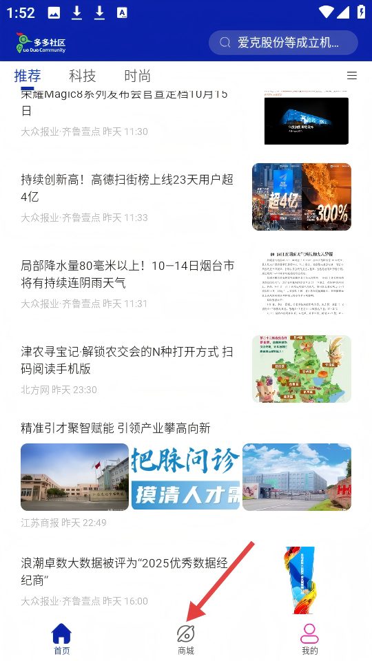 1、在多多社区首页,点击底部【商城】按钮。