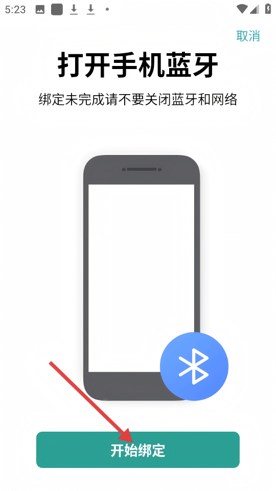 4、在【打开手机蓝牙】页面,打开蓝牙后点击【开始绑定】。