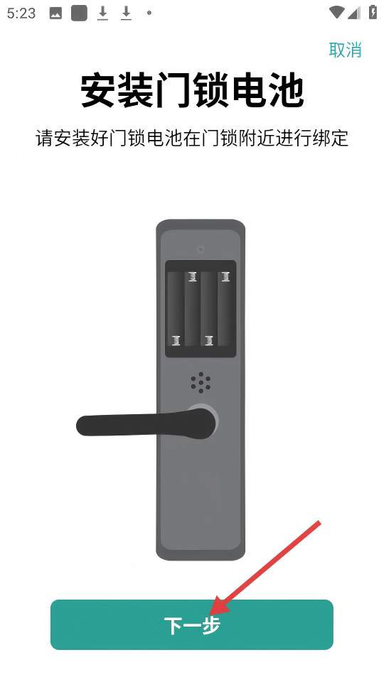 3、在【安装门锁电池】页面,安装好门锁电池后,点击【下一步】。