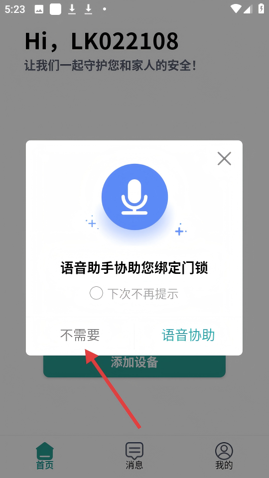 2、在弹出的【语音助手协助您绑定门锁】窗口中,点击【不需要】。
