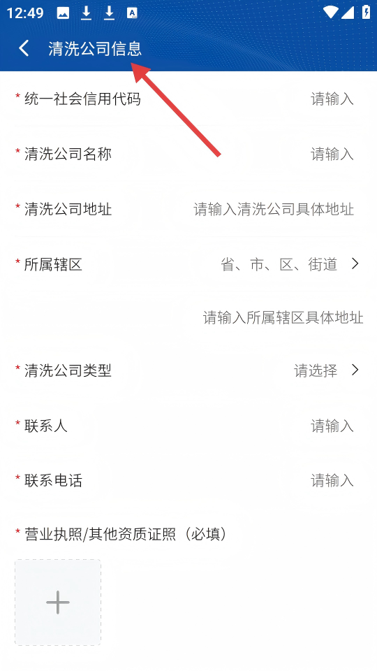 4、在【清洗公司信息】页面,填写【统一社会信用代码】【清洗公司名称】等相关信息。