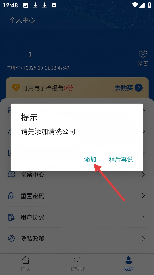 3、在弹出的提示框中,点击【添加】按钮,进入清洗公司信息填写页面。