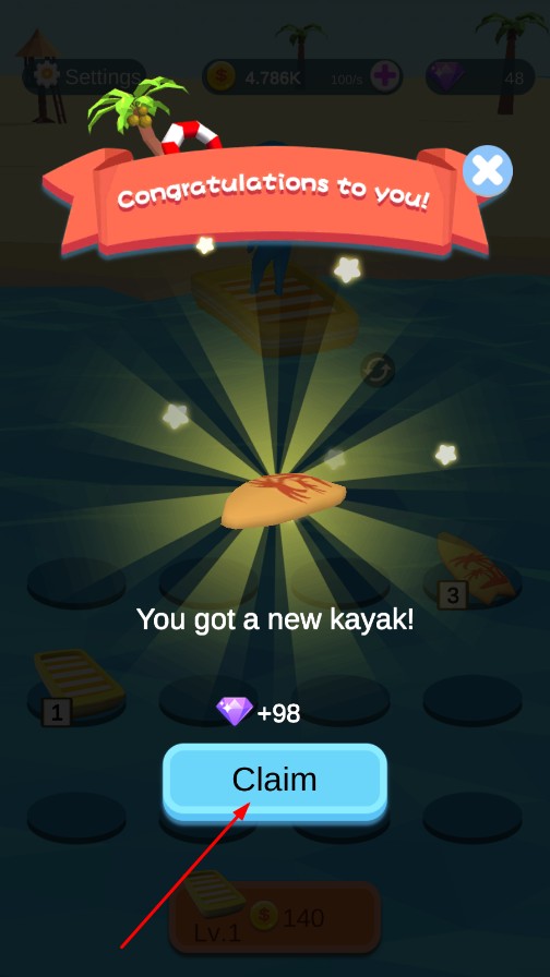2、获得新皮划艇时,点击【Claim】按钮,可领取+98紫钻奖励,丰富道具储备。