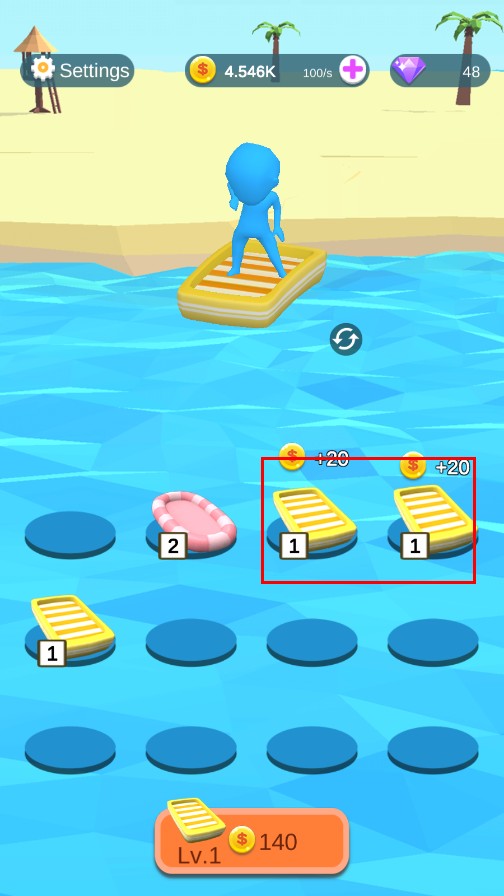 1、将两个【1级】黄色浮板合成为更强大的2级滑板。