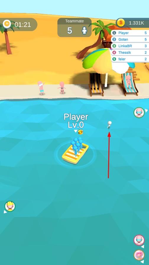 3、在多人水上场景,朝着白色小人方向移动,集结队友,壮大队伍规模,提升竞争力。