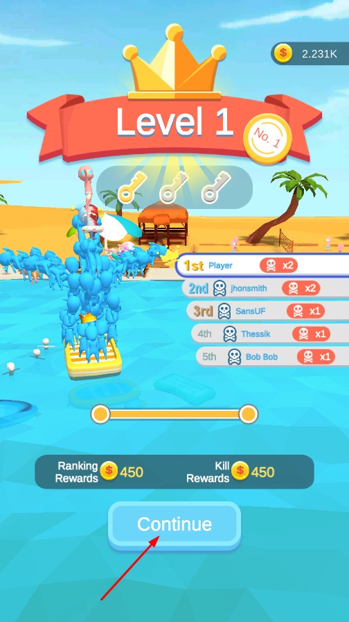 4、Level-1结算时,点击【Continue】按钮,可领取排名和击杀奖励,继续后续关卡挑战。