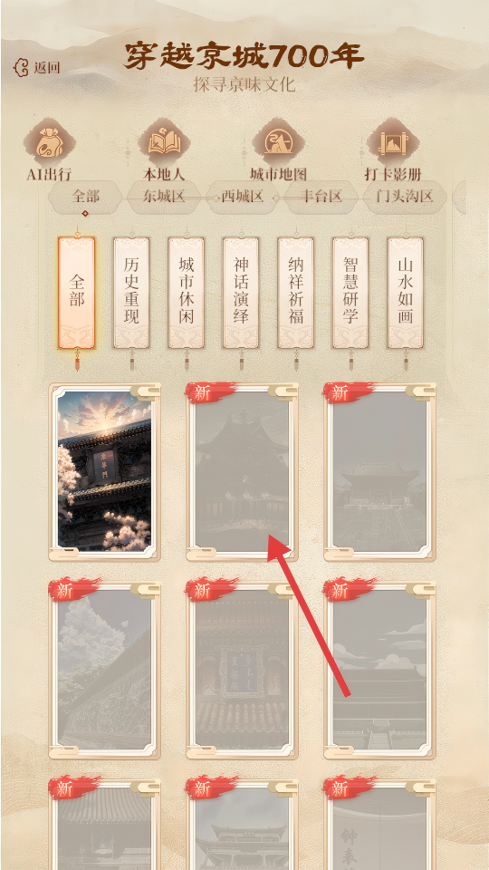 3、在【穿越京城700年】页面,可选择分类后点击相关内容卡片查看。