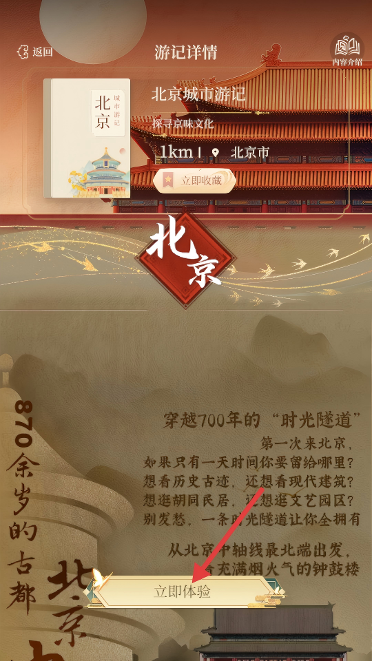 2、进入【北京城市游记】详情页后,点击【立即体验】按钮。