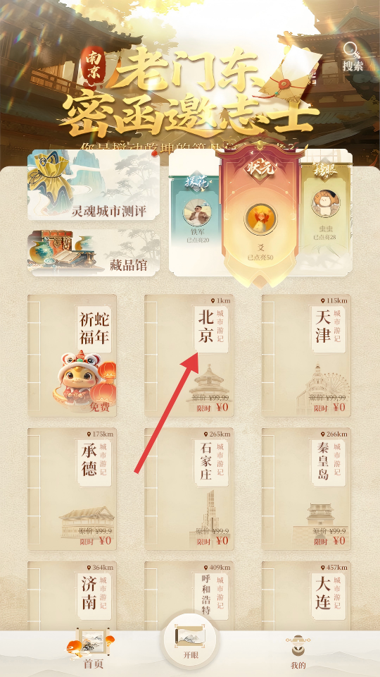 1、进入软件,在界面中点击【北京】城市游记卡片。