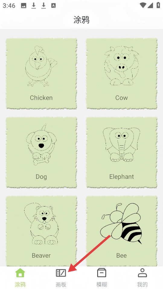 2、在【涂鸦】页面,点击底部的【画板】选项,可进入画板选择页面。